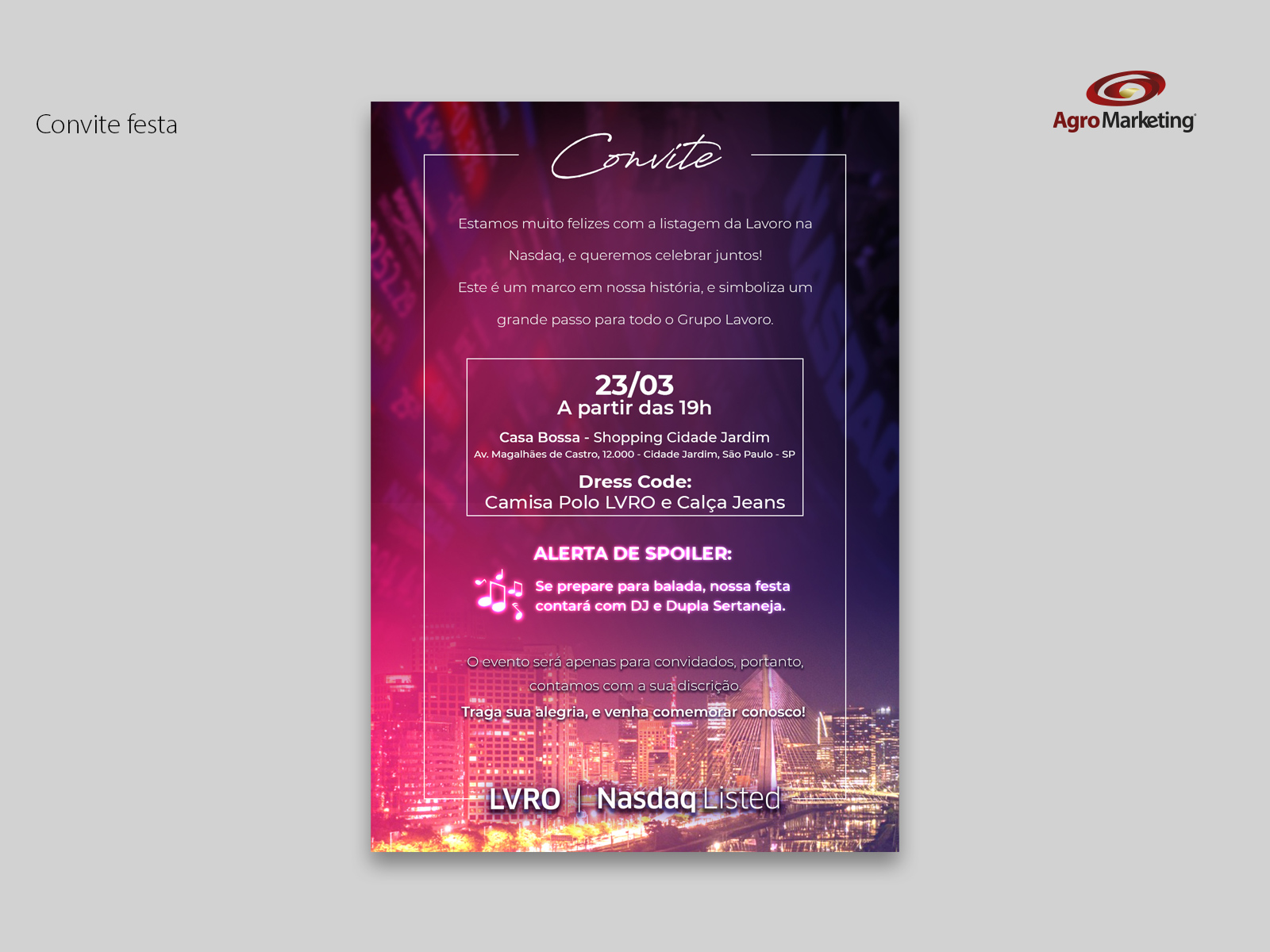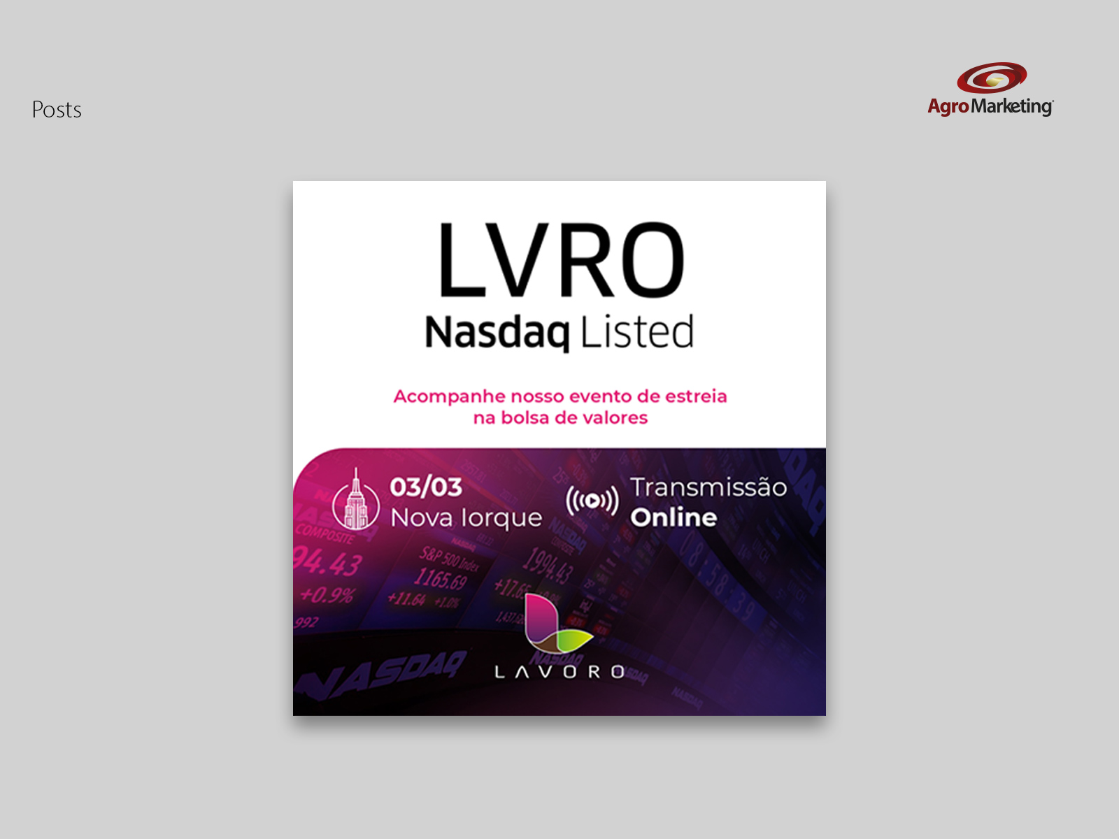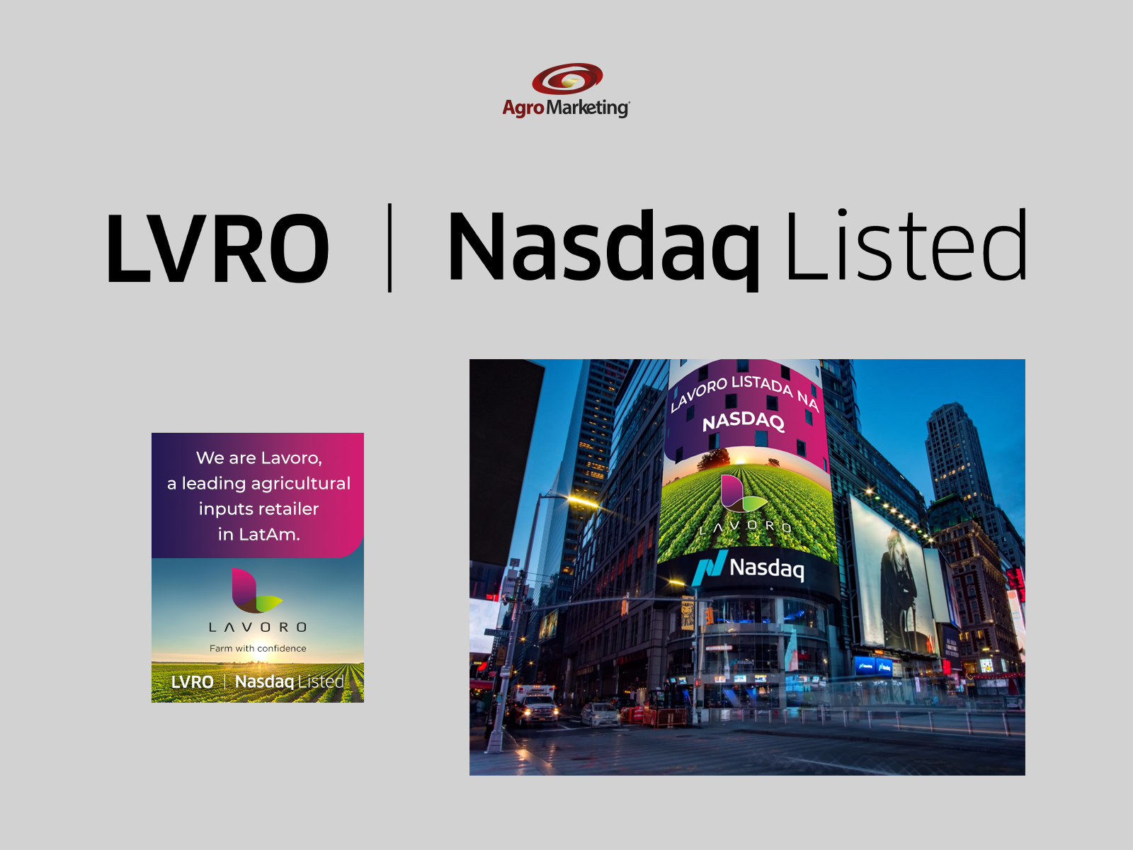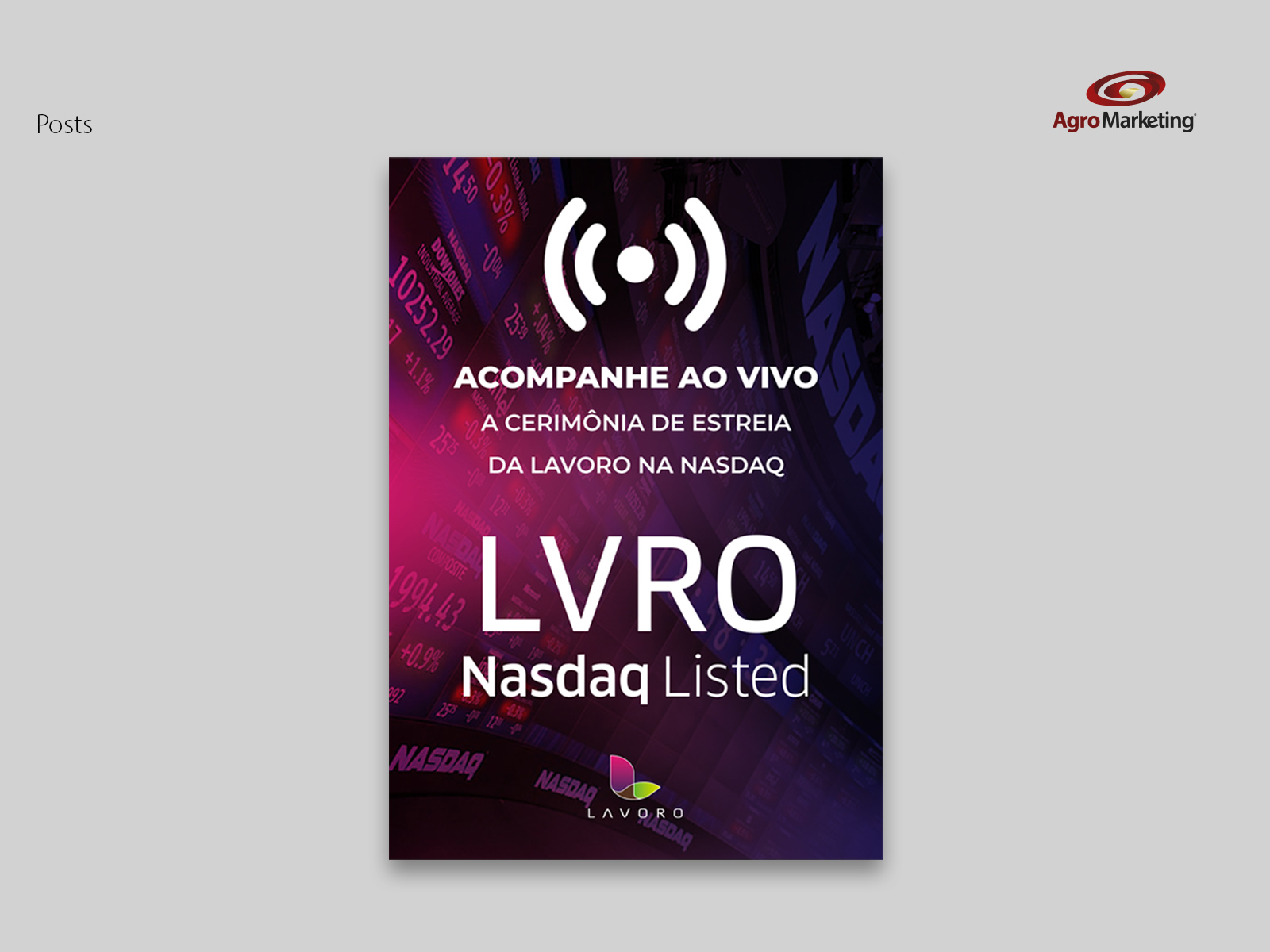 A AgroMarketing esteve presente no IPO da Lavoro, acompanhando a cerimônia de abertura de capital na Nasdaq. Além da produção de diversos materiais institucionais, nossa equipe teve a honra de criar e produzir um vídeo exclusivo que foi projetado na Times Square durante o evento, marcando um momento histórico para a Lavoro no mercado global.